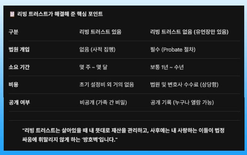 가장 큰 이유는 법원의 검인 절차인 '프로베이트(Probate)'를 피할 수 있다는 점입니다. 유언장만 있는 경우, 사후 법원이 유언장의 효력을 확인후 자산을 분배하는 과정을 거쳐야 합니다. 반면 '리빙 트러스트'라는 선 조치를 취해놓았을 경우, 자산의 소유권이 이미 '신탁'으로 이전되어 있으므로, 사후에 법원을 거치지 않고 즉시 수혜자에게 전달됩니다.